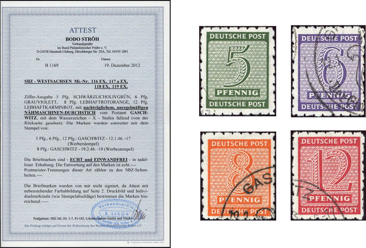 1945, 4 Werte Freimarken Ziffer als kompletter Satz einheitlich in der seltenen Type "E" mit Gaschwitz- Durchstich in gestempelter Luxuserhaltung, Farbfotoattest Ströh BPP in der höchsten Qualitätsstufe "... echt und einwandfrei .... Postmeister- Trennungen dieser Art zählen zu den SBZ- Seltenheiten .... " (ME 9.000.-)