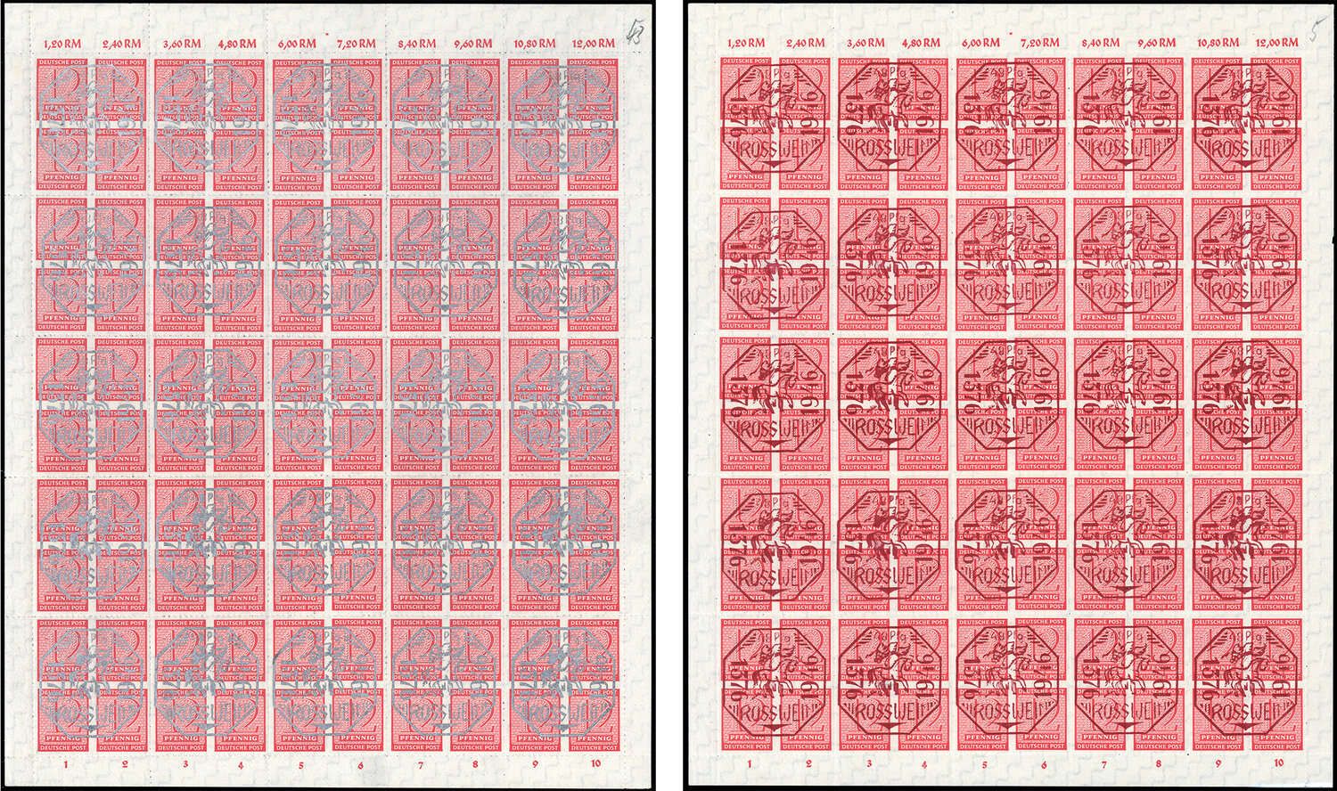 1946, 2 Werte Freimarken der Sowjetischen Zone mit Überdruck in postfrischen Original- Bögen einmal gefaltet. Gesamtauflage nur 375 Bogen- Sätze und vermutlich nur ganz wenige vollständige Bogen- Sätze vorhanden, geprüft Zierer BPP