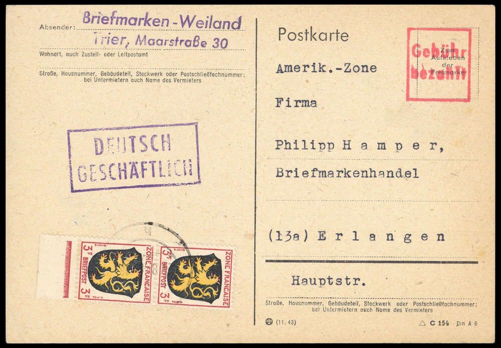 1946, Postkarte mit violettem Ra2 "Gebühr bezahlt" und Unterrandpaar Nr. 2 frankiert von TRIER 24.8.46 nach Erlangen, leichte Rand- und Alterungsspuren.