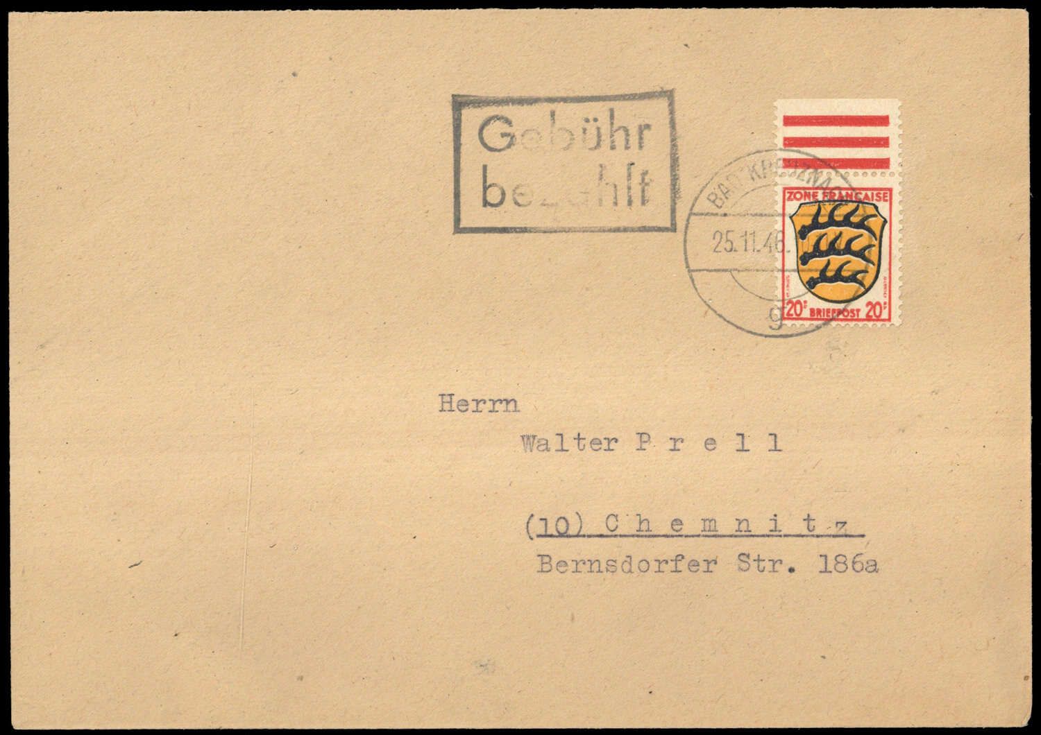 1946, 20 Pfg. Wappen (Oberrand) auf PRELL-Brief von BAD KREUZNACH 25.11.46, nebengesetzt schwarzer Ra2 "Gebühr bezahlt" nach Chemnitz, leichte Spuren.