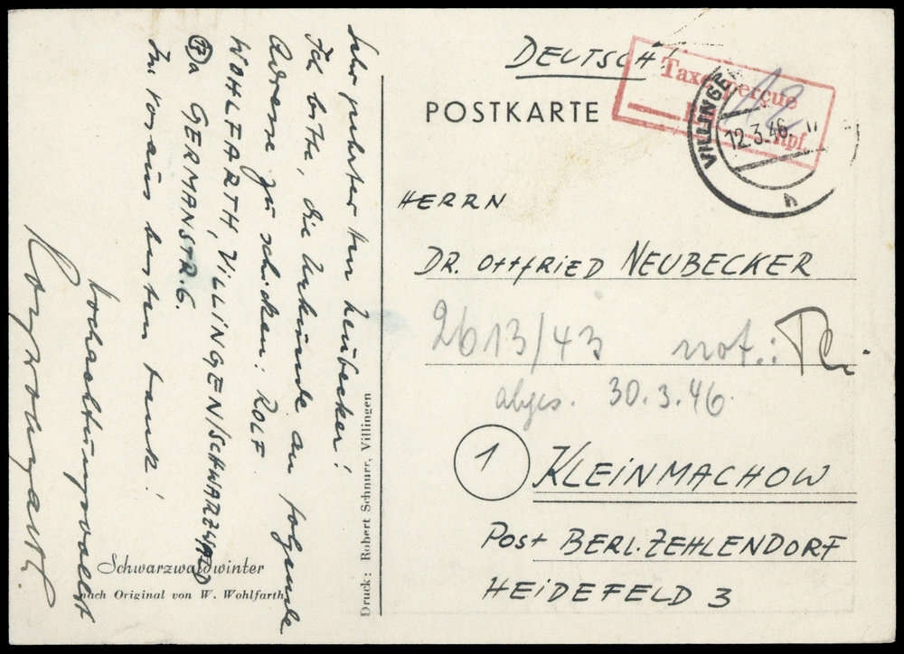 1946, Postkarte mit rotem Ra2 "Taxe percue RM Rpf. / hds. 12" und Poststpl. "VILLINGEN (SCHWARZ) 12.3.46" nach Kleinmanchow, hds. Vermerke, leichte Spuren.