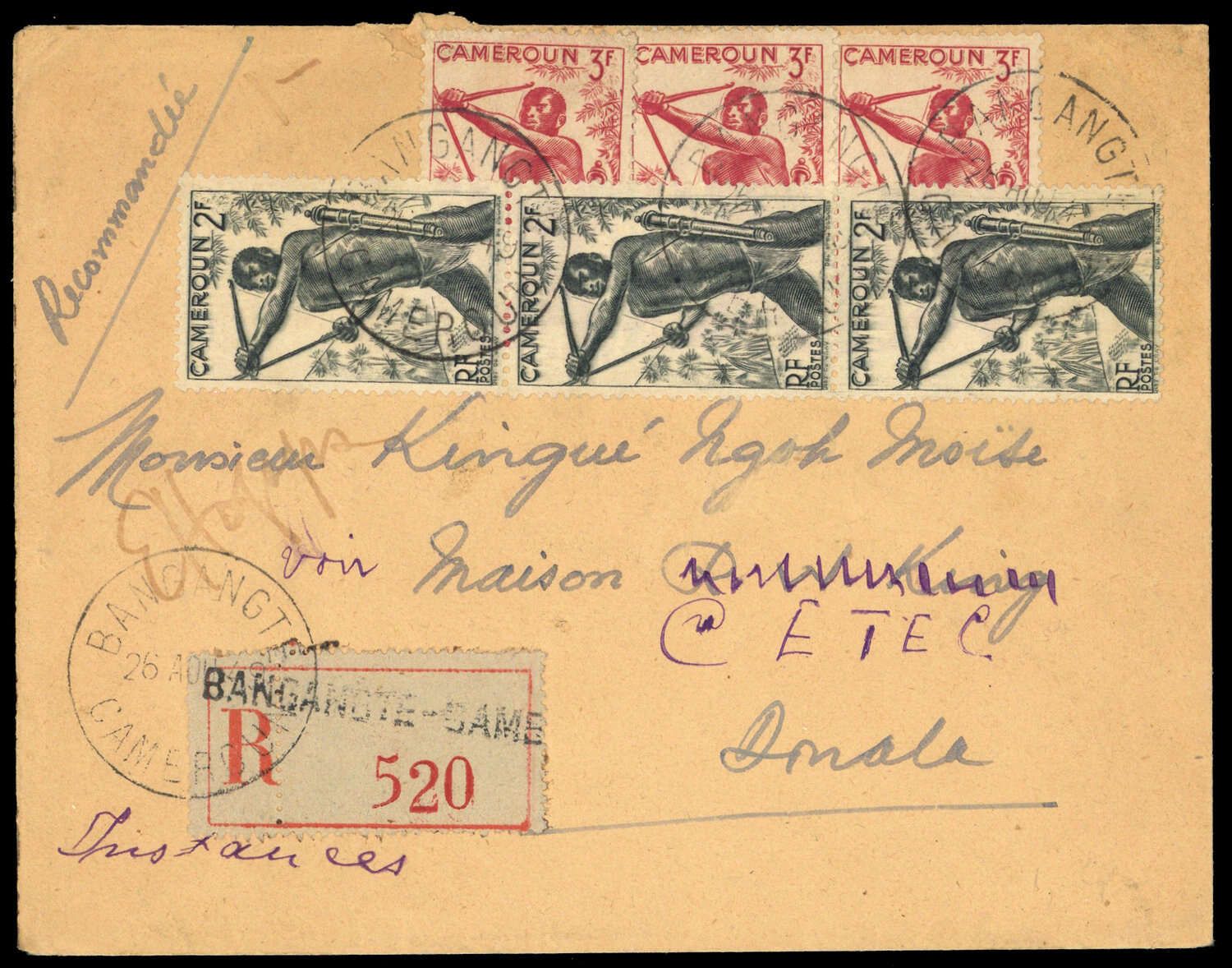 1946, 2 und 3 Fr Bogenschütze (je 3, Randklebung) auf R-Brief, K1 "BANGANGTE 26 AOUT (46)", R-Brief, Beförderungs- Öffnungsspuren, nach Duala