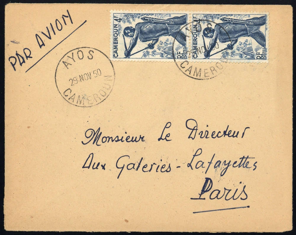 1946, 4 Fr Bogenschütze, senkr. Paar, MeF, unregelmässige Zähnung, K1 "AYOS 29 NOV 50", Luftpostbrief, Beförderungs- Altersspuren, nach Paris