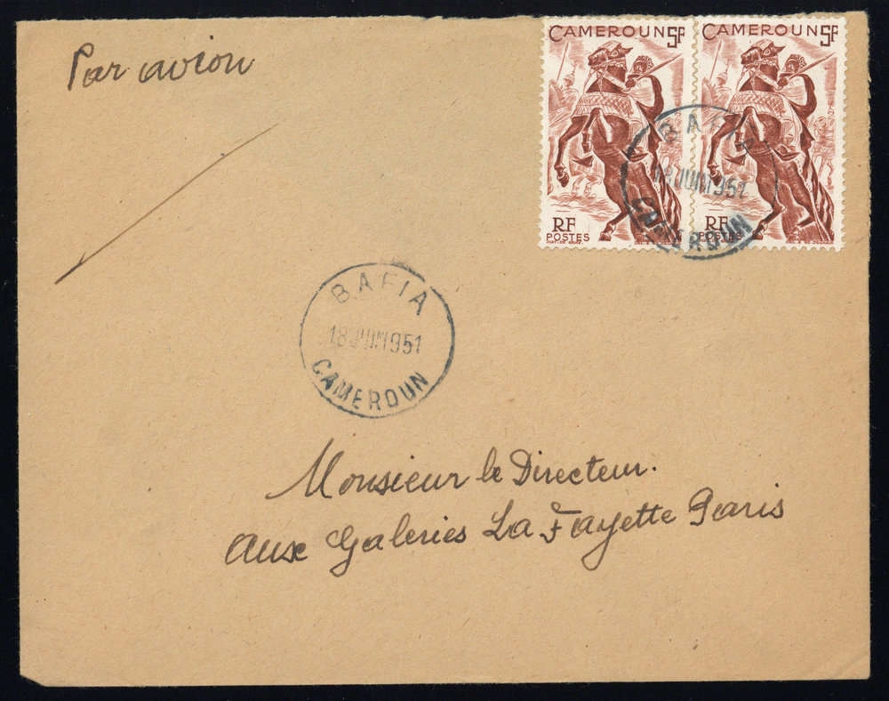 1946, 5 Fr Reiter (2), MeF, unregelmässige Zähnung, K1 "BAFIA 18 JUIN 1951", Luftpostbrief, rs. ohne Lasche, Beförderungs- Altersspuren, nach Paris
