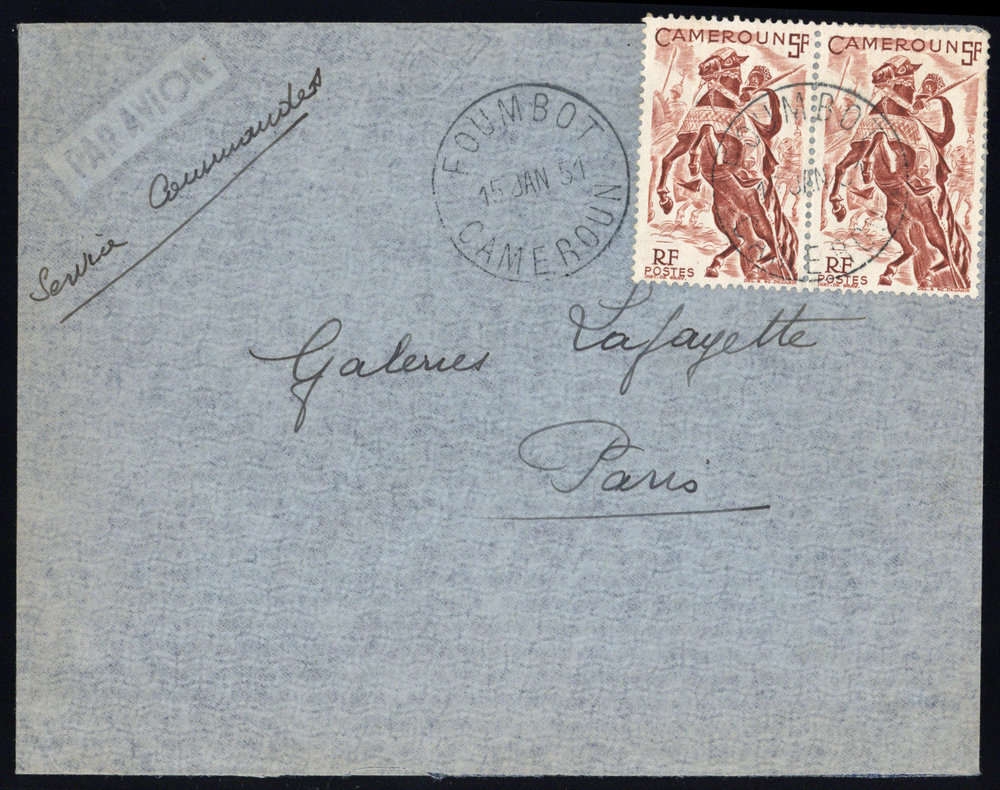 1946, 5 Fr Reiter (Paar), MeF, unregelmässige Zähnung, K1 "FOUMBOT 15 JAN 51", Luftpostbrief, Beförderungs- Altersspuren, nach Paris