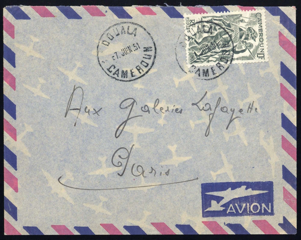 1946, 10 Fr Reiter, unregelmässige Zähne, K1 "DOUALA 7.JUIN.51", EF, Luftpostbrief Alters- Beförderungsspuren, nach Paris