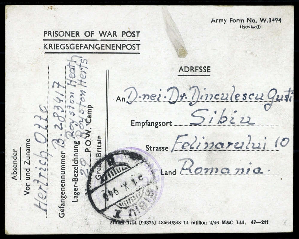 1946, "Kriegsgefangenenlager", POW-Postkarte, aus dem britischen Camp, Nr. "29", Beförderungs- Altersspuren, Ankunfts-DB "SIBIU 31.X.946"