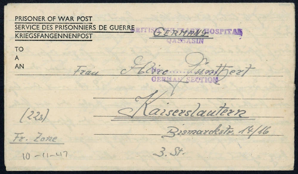 1947, Unfrankierter Kriegsgefangenenpostvordruck Brief vom 10.11.1947 aus Ägypten nach Kaiserslautern, mit Gummistempel "British Military Hospital Qassasin" und "No..German Section"