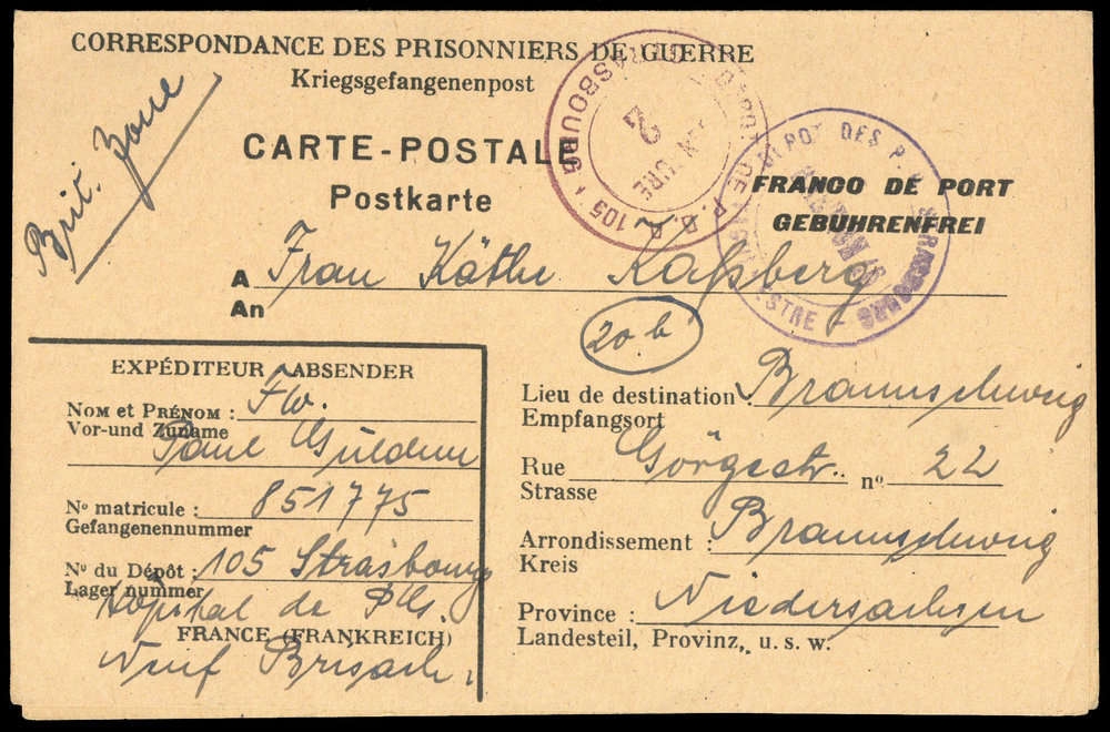 1947, Kriegsgefangenenpost-Doppelkarte "FRANCO DE PORT", aus Strasbourg, roter K2 "DEPOT DE P.G.A. 105 CENSURE 2", sowie K2 "STRASBOURG ..", hs. "Brit. Zone", Beförderungsspuren, nach Braunschweig