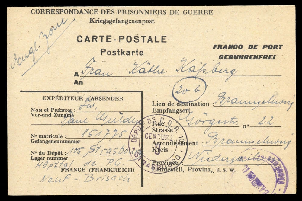 1947, Kriegsgefangenenpost-Doppelkarte "FRANCO DE PORT", aus Strasbourg, viol. K2 "DEPOT DE P.G.A. 105 CENSURE 3", sowie K2 "BASTION 15 ..", hs. "Engl. Zone", Beförderungsspuren, nach Braunschweig