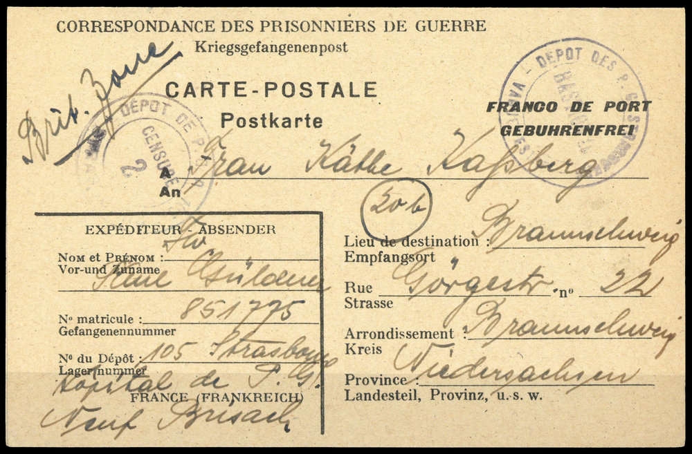 1947, Kriegsgefangenenpost-Doppelkarte "FRANCO DE PORT", aus Strasbourg, viol. K2 "DEPOT DE P.G.A. 105 CENSURE 2", sowie K2 "BASTION 15 ..", hs. "Brit. Zone", Beförderungsspuren, nach Braunschweig