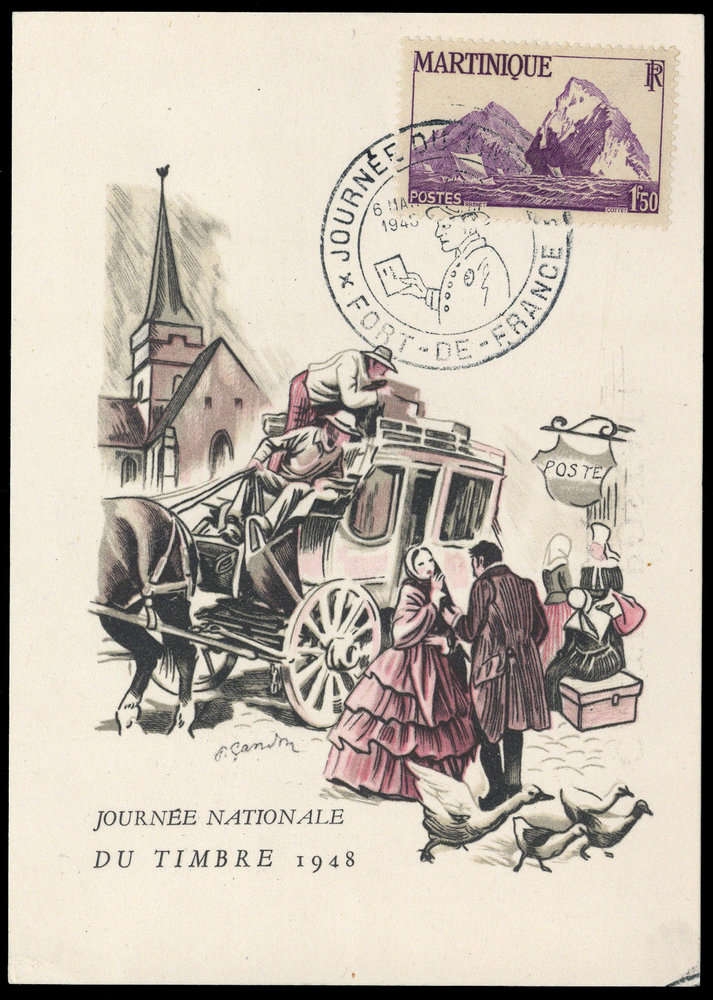 1947/48, 1.50 Fr Uferfelsen, vs. auf farbiger "Tag der Marke 1948", Sonder-Karte, SST "FORT-DE-FRANCE 6 MAR 1948 JOURNÉE DU TIMBRE"
