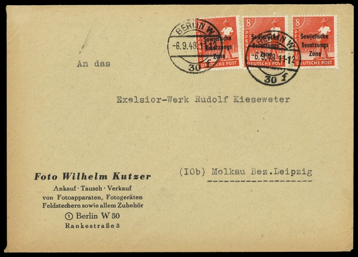 1948, SBZ 8 Pfg. Arbeiter/Maschinenaufdruck, 3mal als portoger. MeF auf Brief aus "BERLIN W 30 6.9.48" nach Molkau Bez. Leipzig, Alterungsspuren