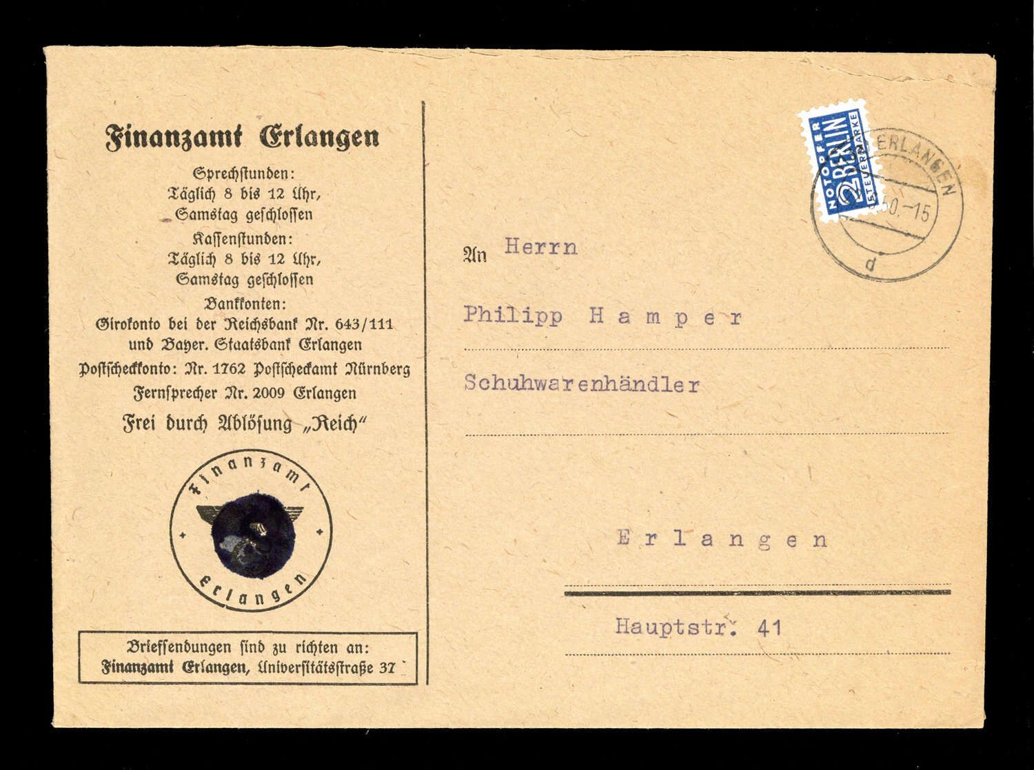 1948, 2 Pfg. Notopfer Berlin auf Finanzamts-Brief (alter 3. Reich Briefstempel geschwärzt) von ERLANGEN 22.5.50 nach Erlangen, leichte Randspuren.