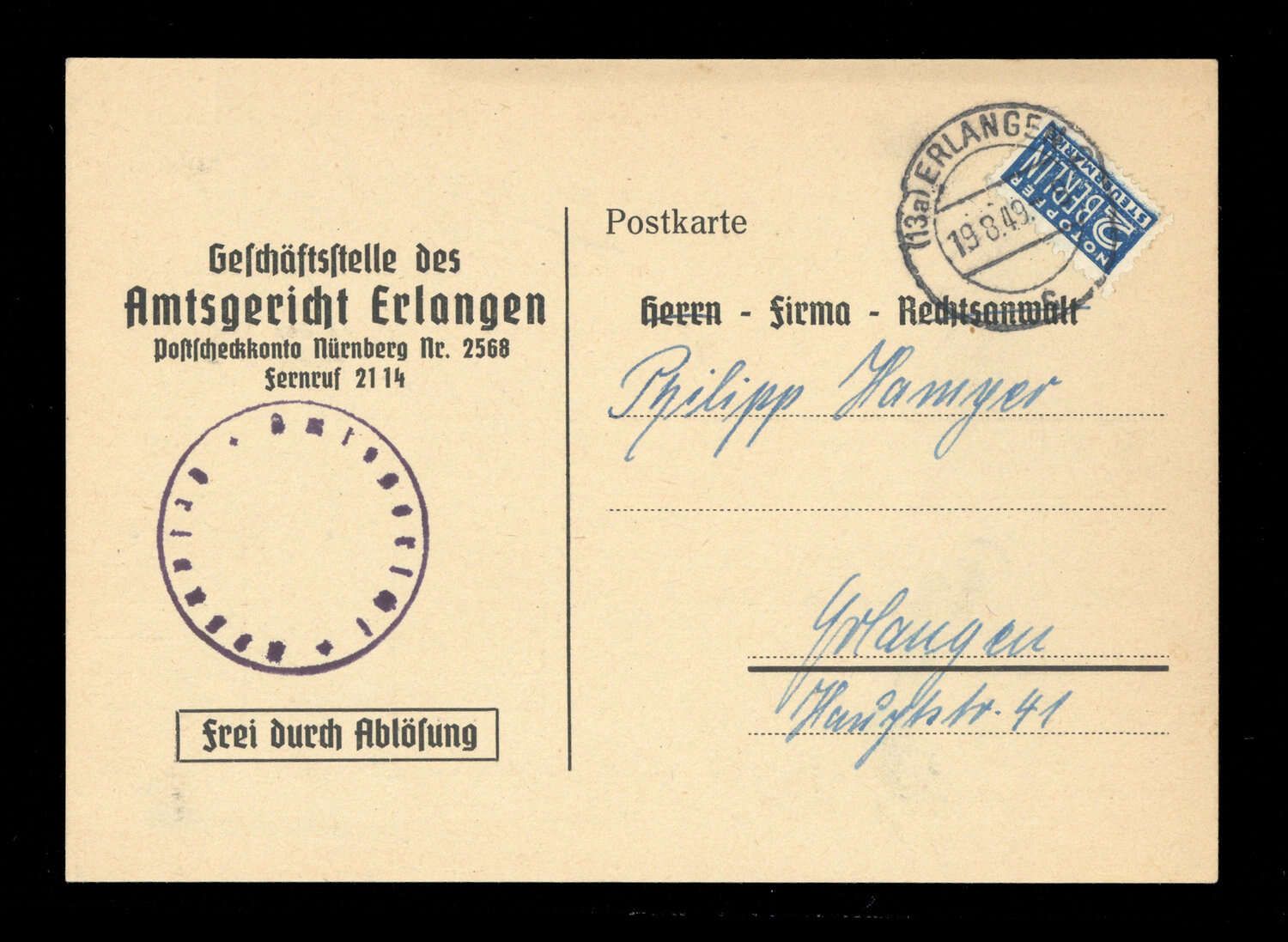 1948, 2 Pfg. Notopfer Berlin auf vorgedruckter Gerichts-Postkarte (Amtsgericht Erlangen mit violettem Briefstpl.) von ERLANGEN 19.8.49 nach Erlangen, leichte Spuren.