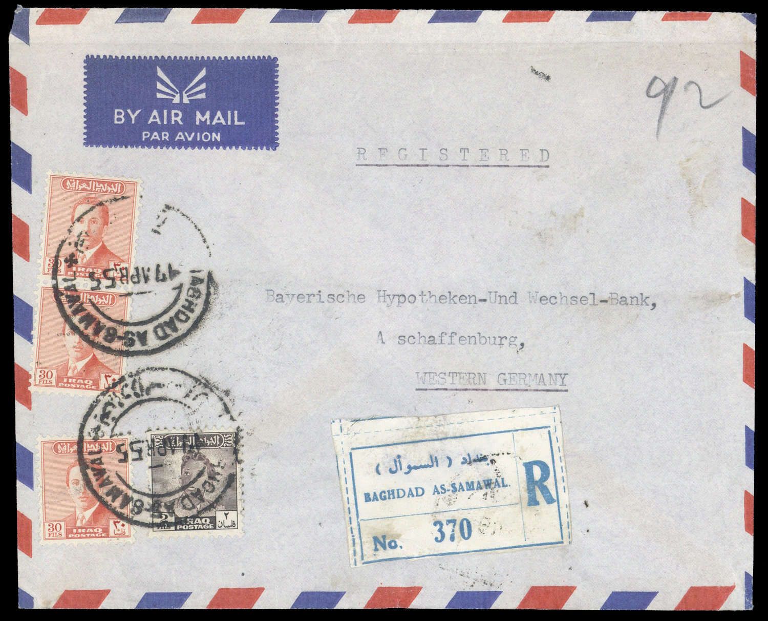 1948/55, 30 F Faisal II (3), Zusatz 2 F braun, Bank-Luftpost-R-Brief, K2 "BAGHDAD AS-SAMAWAL 17 APR 55", Beförderungs- Altersspuren, nach Aschaffenburg
