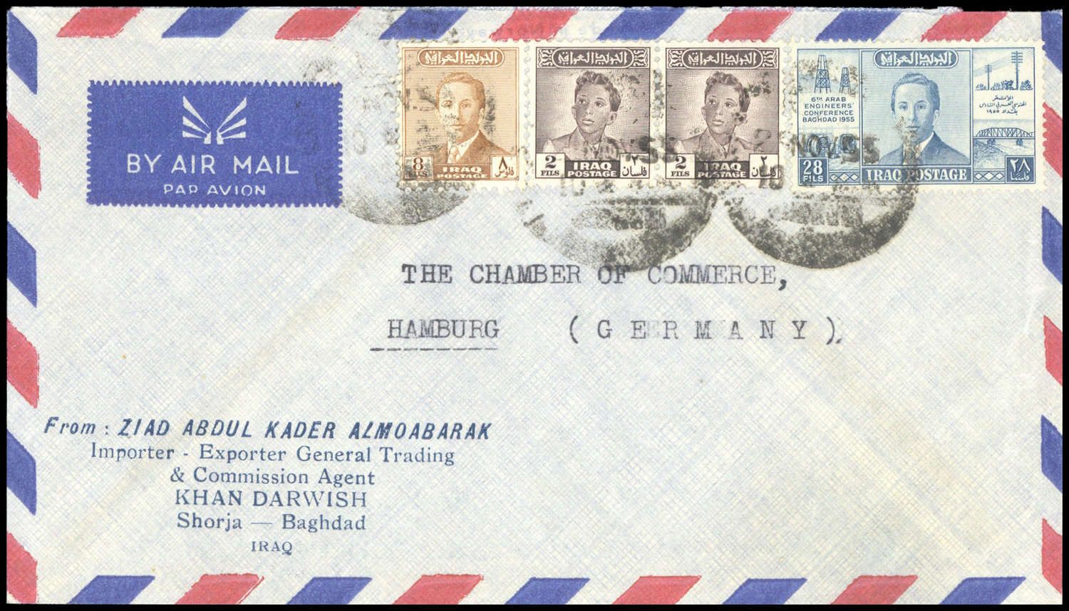 1948/55, 2 F sepia (2) mit 8 F gelbbraun und 28 F Ingenieurkontress, Firmen-Luftpostbrief aus Baghdad "2 NOV 55", Beförderungsspuren, nach Hamburg