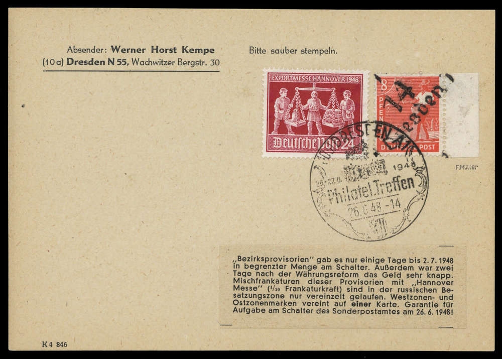 1948, 8 Pfg. Arbeiter "Dresden", rechtes Randstück mit Kontrollrat Nr. 969 auf KEMPE-Karte mit SST "DRESDEN 26.6.1948 / Philatel.Treffen", signiert F. Müller.