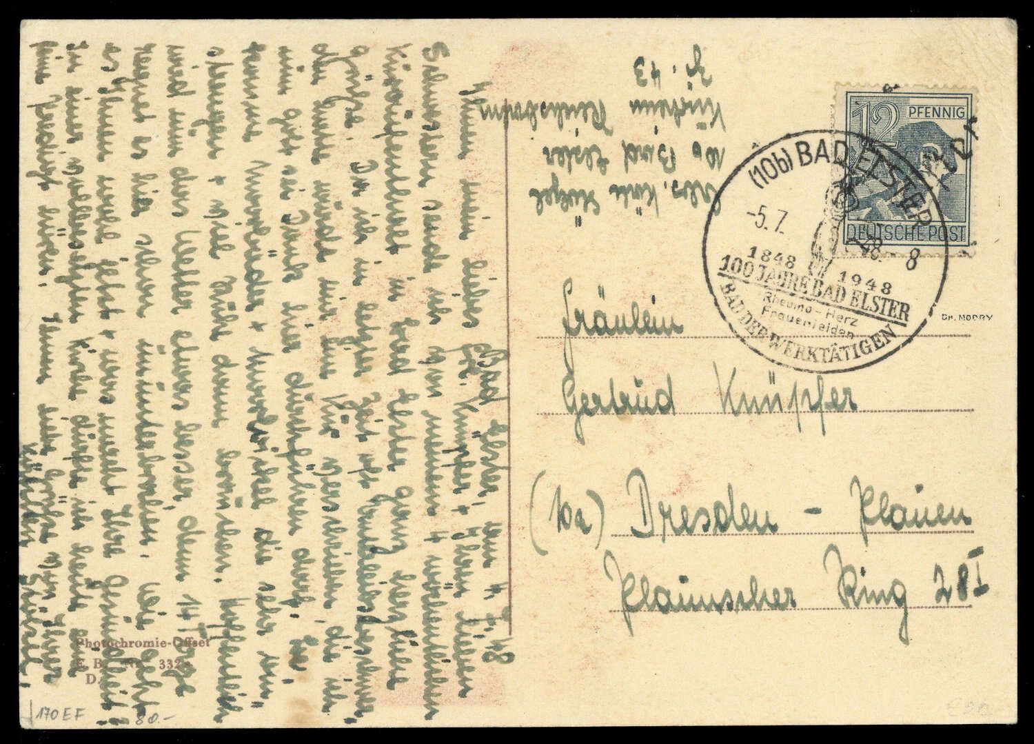 1948, 12 Pfg. Arbeiter auf Bedarfspostkarte mit SST "BAD ELSTER 5.7.48" nach Dresden, leichte Alterungsspuren.