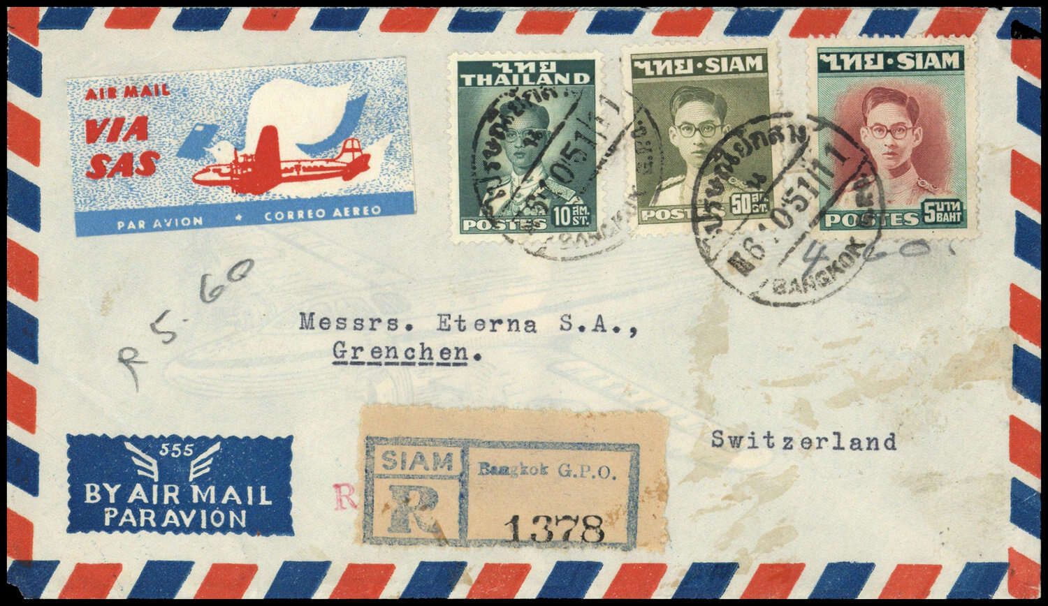 1948/51, 5 B Bhumibol, 2 Marken Zusatz, DB "BANGKOK 6 10 51", Luftpost-R-Brief, Alters- Beförderungs-, bs. Klebespuren, Ak "GRENCHEN 9.X.51"/CH