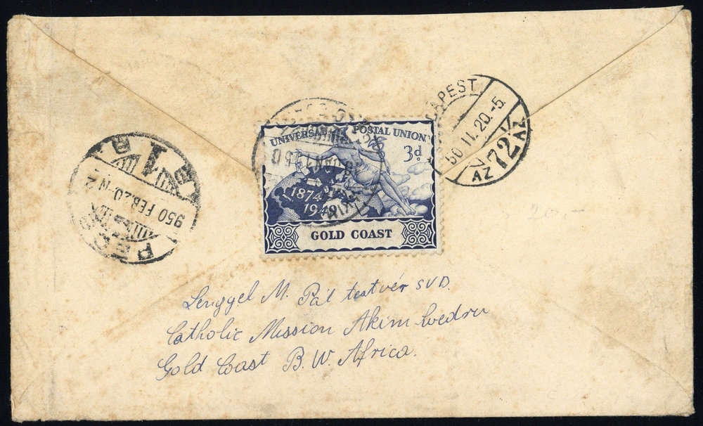 1949, 3 P UPU (Mängel) rs. auf Brief, Beförderungs- Altersspuren, DB "AKIM SWEDRU 18 JAN 1950", via Budapest, Ak-DB "PECS 950 FEB.20"