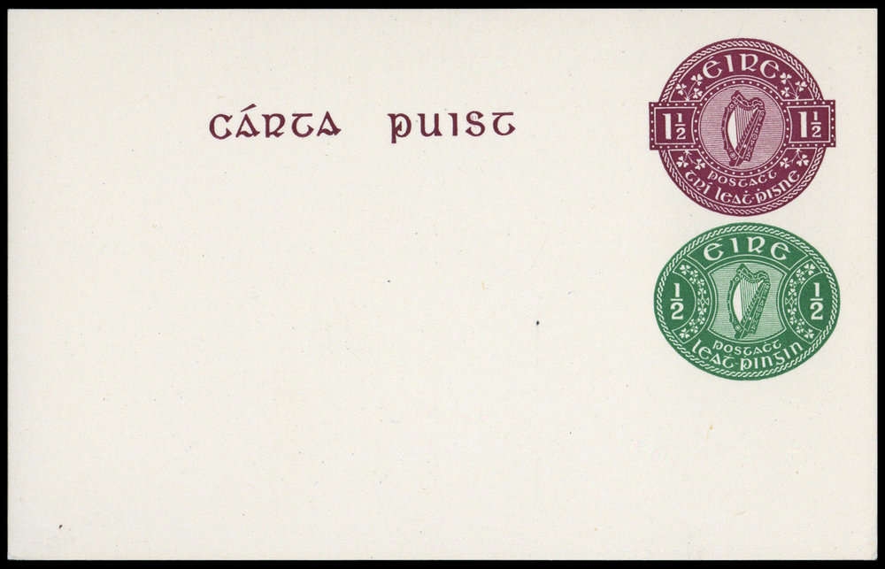 1949, 1 1/2 Pg. unten 1/2 Pg. Irische Harfe, Ganzsache bezüglich Portoerhöhung, ungebraucht.