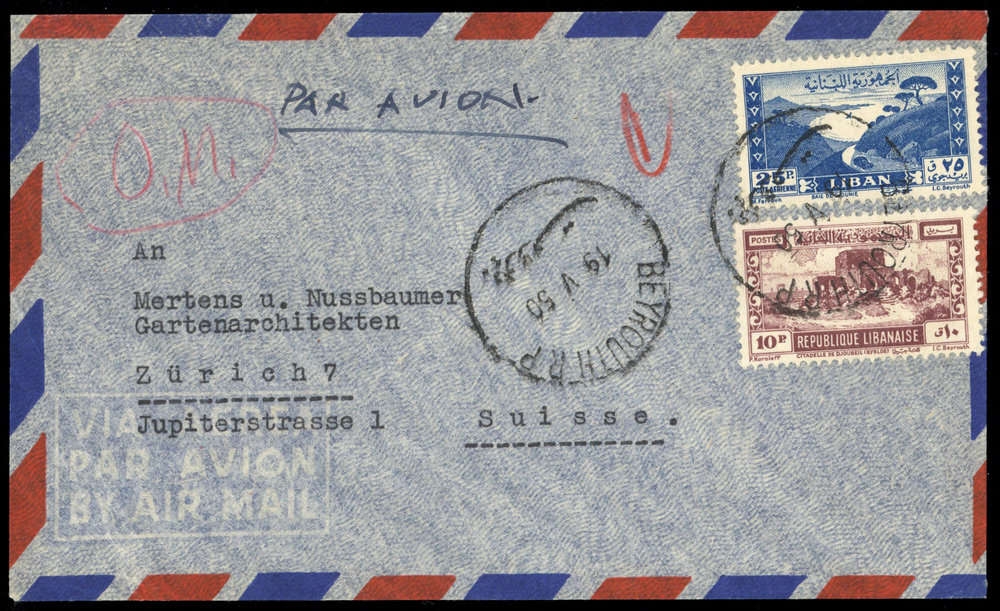 1949, 10 Pia lilabraun mit 25 Pia blau, K1 "BEYROUTH 19 V 50", Luftpostbrief, nach Zürich