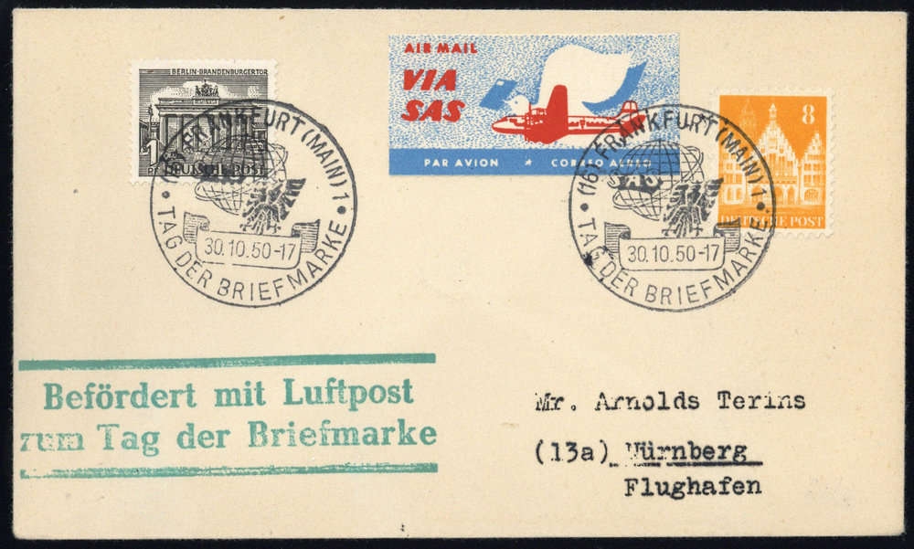 1950, SAS-Flugpostbrief mit Nr. 42 und BIZONE 8 Pfg. Bauten mit SST "FRANKFURT (MAIN) 30.10.50 - TAG DER BRIEFMARKE" nach Nürnberg, grüner Bestätigungsstpl. "Befördert mit Luftpost zum Tag der Briefmarke".