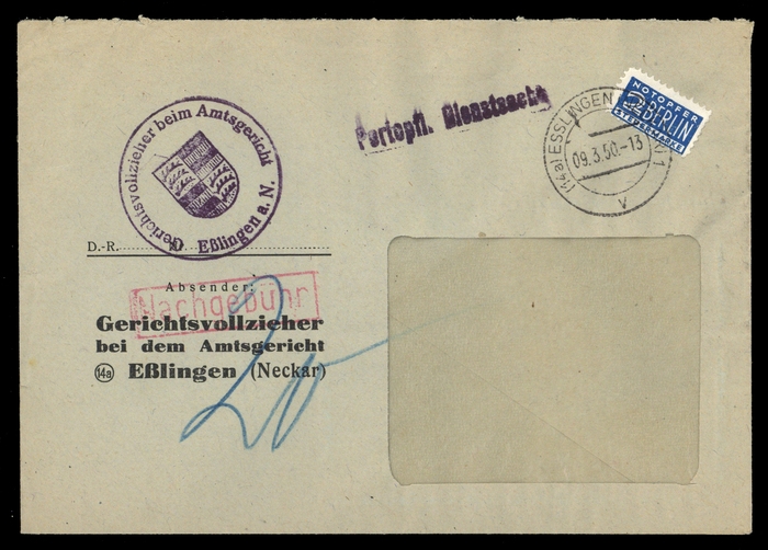 1950, "Portopfl. Dienstsache", L1 auf Fensterumschlag des Amtsgerichts, K2 "ESSLINGEN 09.3.50", 2 Pf Notopfer, roter Ra1 "Nachgebühr", hs. "20" Pf, Beförderungsspuren