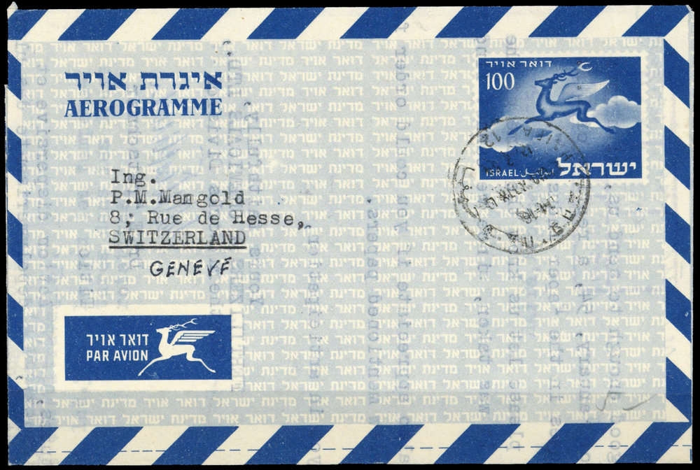 1950, 100 (Pr) blau, Luftpostfaltbrief UPU, K1 "HAIFA 10.2.54", inwendig gelocht, Beförderungsspuren, nach Genf