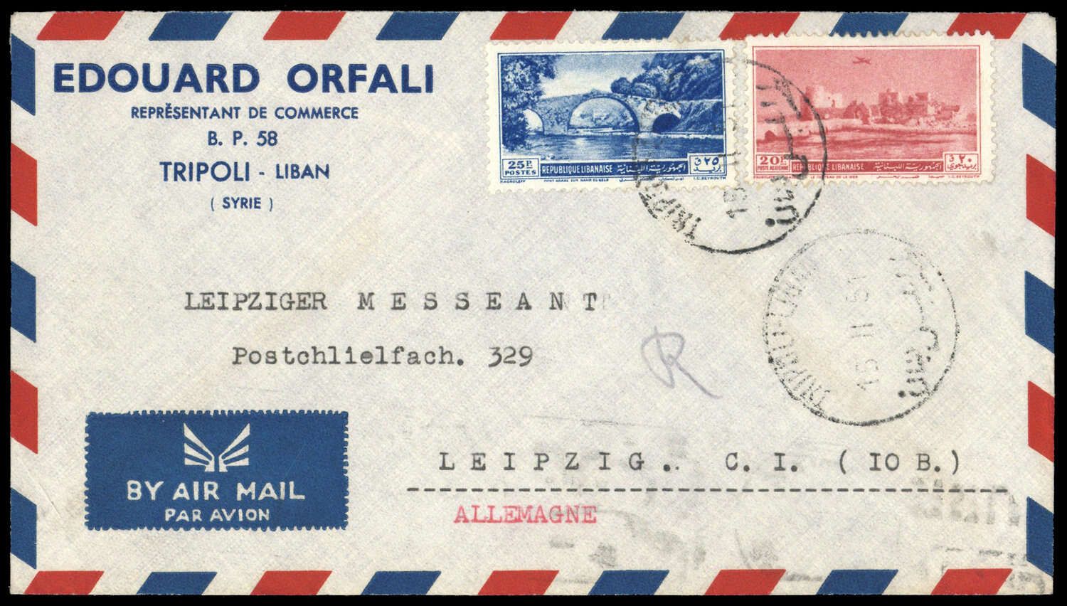 1950, 25 Pia Brücke mit 20 Pia Sidon, Firmen-Luftpostbrief, Beförderungsspuren, nach Leipzig