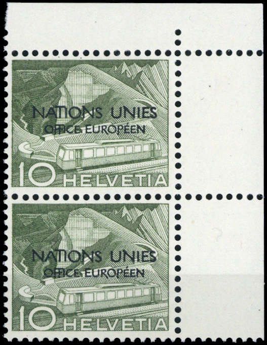 1950, 10 C. Landschaft im postfrischen Eckrandpaar r.o. mit einmal dem Plattenfehler "A beschädigt" auf Feld 10 (ME 51.-)