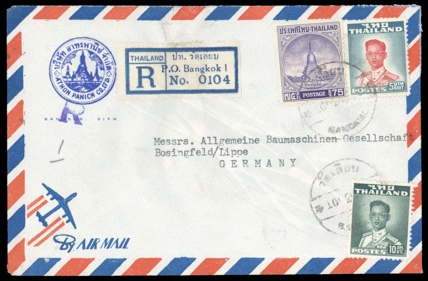 1951, 5 B Bhumibol, 2 Marken Zusatz, Luftpost-R-Brief, DB "BANGKOK 10.2...", Alters- Beförderungsspuren, nach Bosingfeld/D