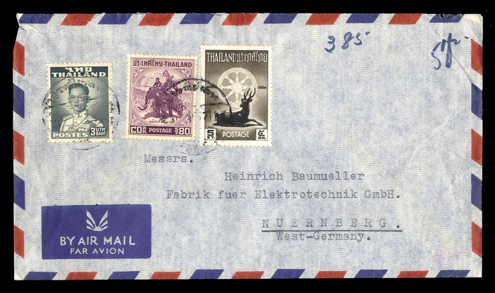 1951/57, 80 S. Naresuan, mit Zusatz Mi.-Nr.292A und 331 auf Luftpostbrief, Beförderungsspuren, etwas unsauber geöffnet, nach Nürnberg