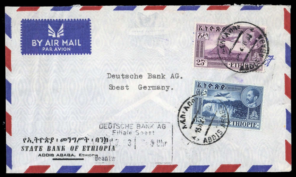 1952/55, 25 und 35 C Flug, Luftpostbrief aus "ADDIS ABABA 15 ..", nach Soest/D, Beförderungsspuren
