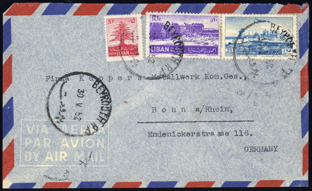 1952, 35 Pia Sidon, 10 Pia Akropolis und 5 Pia Zeder, K1 "BEYROUTH 30 V 52", Luftpostbrief, Beförderungsspuren, nach Bonn
