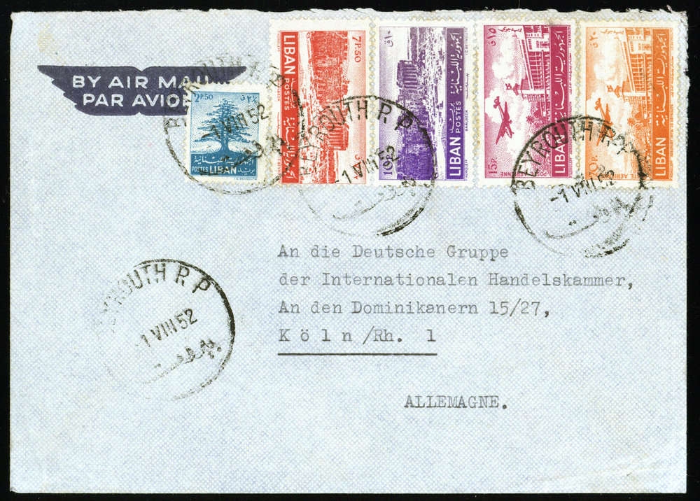 1952, 7.50 und 10 Pia Akropolis, mit 15 und 20 Pia Flughafen, Randklebung, 2.50 Zeder Zusatz, Luftpostbrief, Beförderungsspuren, K1 BEYROUTH 1.VIII.52", nach Köln