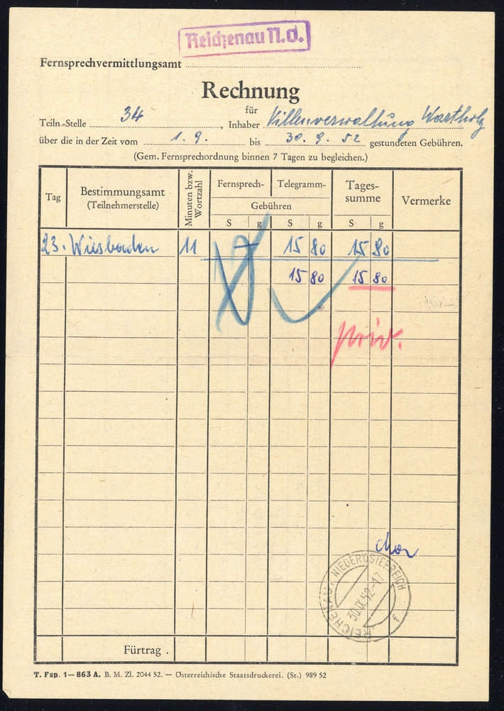1952, Rechnung "Fernsprechvermittlungsamt REICHENAU N.Ö." vom 30.9.1952 mit Poststpl. "REICHENAU NIEDERÖSTERREICH 30.IX.52", etwas größeres Format, waagerechter Mittelbug, leichte Spuren.