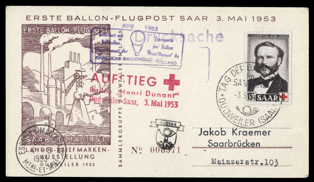 1953, ERSTE BALLON-FLUGPOST SAAR auf passender, nummerierter Sonderkarte mit Nr. 343 inkl. SST "DUDWEILER 3.5.1953 TAG DER BRIEFMARKE", adressiert nach Saarbrücken, entsprechende Stempelvermerke u.a. roter Sonderbestätigungsstempel "Ballon HENRI DUNANT".
