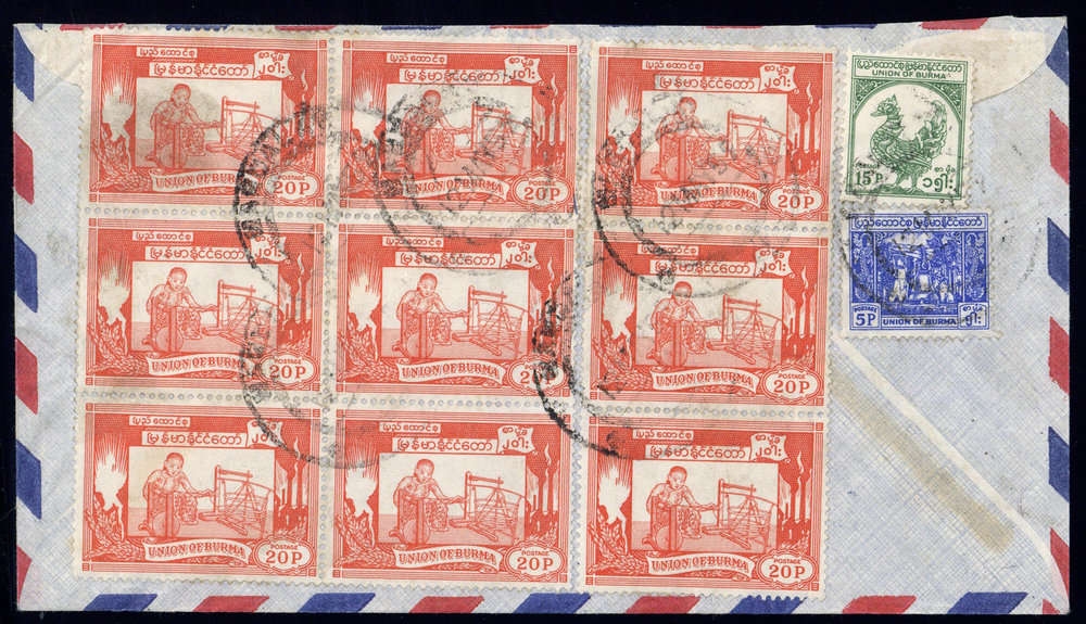 1954, 20 p ziegelrot (9), Zusatz Mi.-Nr.143 und 145, K2 "MANDALAY 12 MAY 59", rs. auf Luftpostbrief, Beförderungs- Altersspuren, nach München