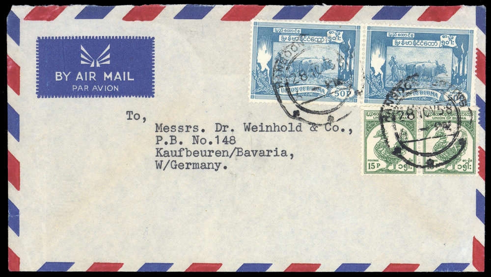 1954, 50 P Pflüger und 15 P Hamsa, je im Paar, K2 "RANGOON 28 NOV 58", Luftpostbrief, Beförderungsspuren, rs. ohne Lasche, nach Kaufbeuren