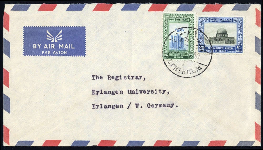 1954, 25 F Artemis mit 20 F Felsendom (Mängel), DB "BETHLEHEM .. 58", Luftpostbrief, mittig senkr. Faltung, Beförderungsspuren, nach Erlangen