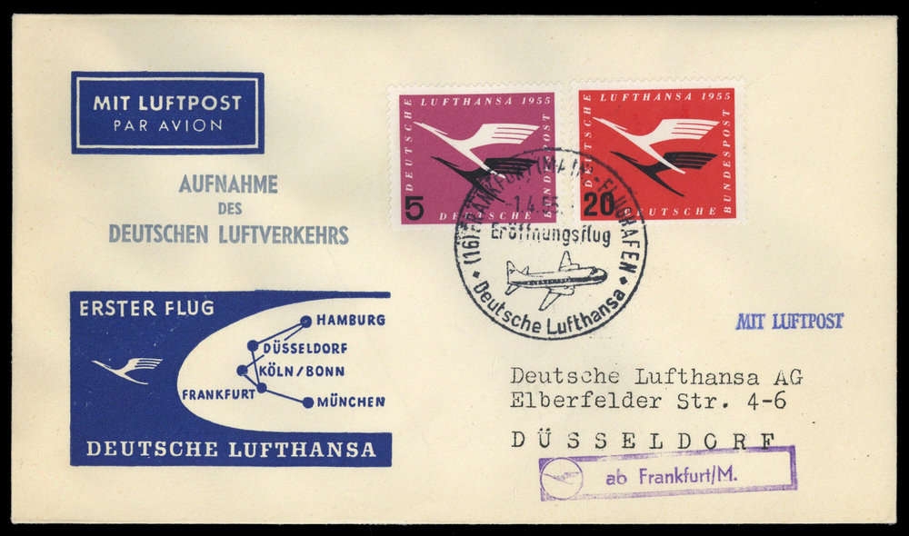 1955, ERSTFLUG DEUTSCHE LUFTHANSA (Frankfurt/Main - Düsseldorf) auf passendem Schmuckkuvert mit Nr. 205 + 208 von FRANKFURT-ERÖFFNUNGSFLUG 1.4.1955, adressiert nach Düsseldorf, violetter Leitstempel "ab Frankfurt/M.", rs. Ankunftsstempel, leichte Spuren.