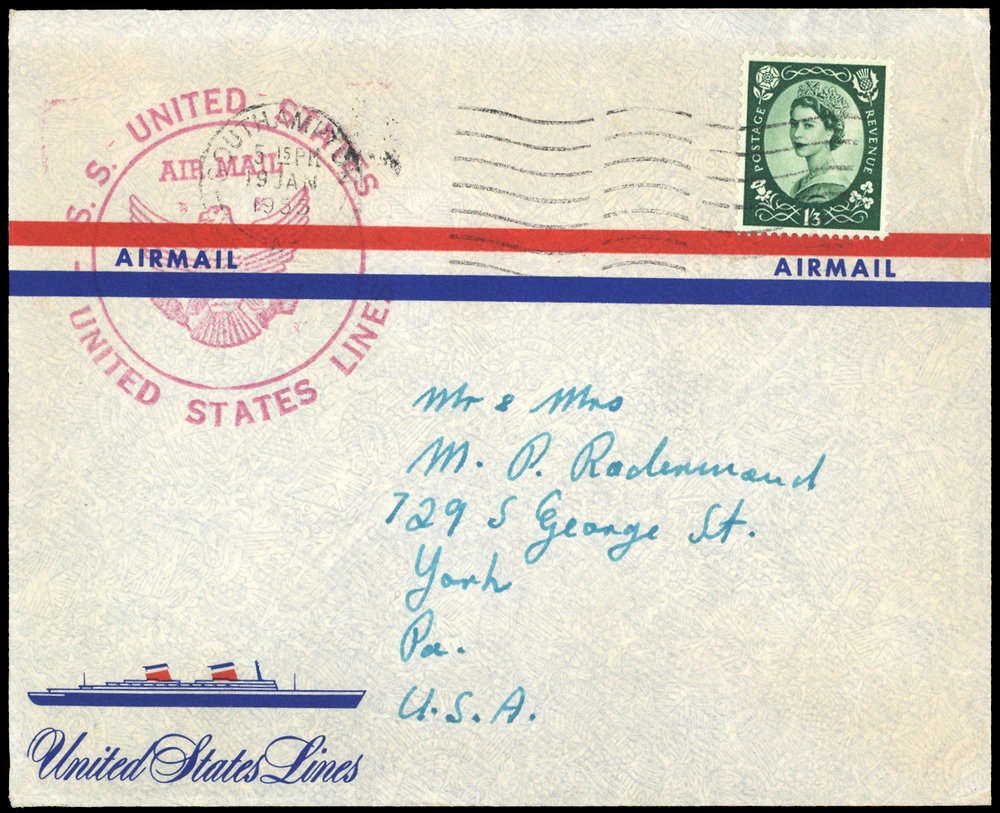 1955, "S.S. UNITED STATES LINES AIR MAIL", roter Flugstpl., sowie 1.3 Sh grün, M-Stpl. "SOUTHAMPTON 19 JAN 1955", Umschlag (Airmail/Schiff), nach USA