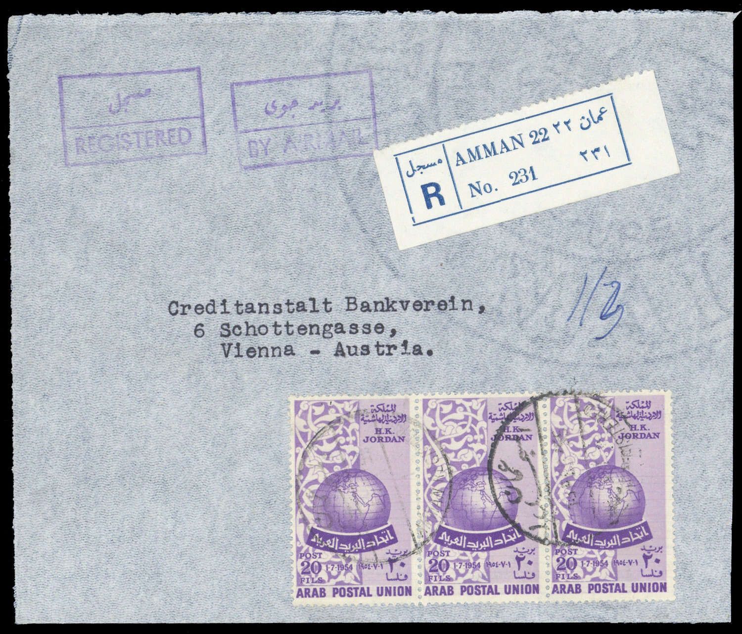 1955, 20 F Arabische Postunion (3), Luftpost-R-Brief, 3-seitig geöffnet, DB "AMMAN ..", nach "WIEN 19.2.55"