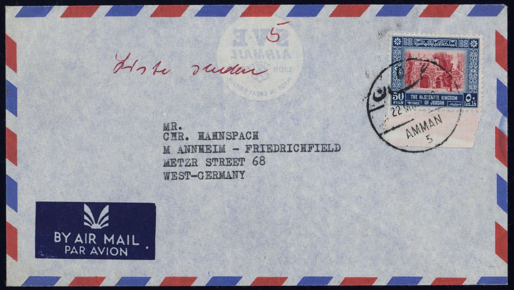 1955, 50 F blau/scharlach, Unterrandstück, DB "AMMAN-5 22 MAY ..", Luftpostbrief, nach Mannheim, rote Vermerke