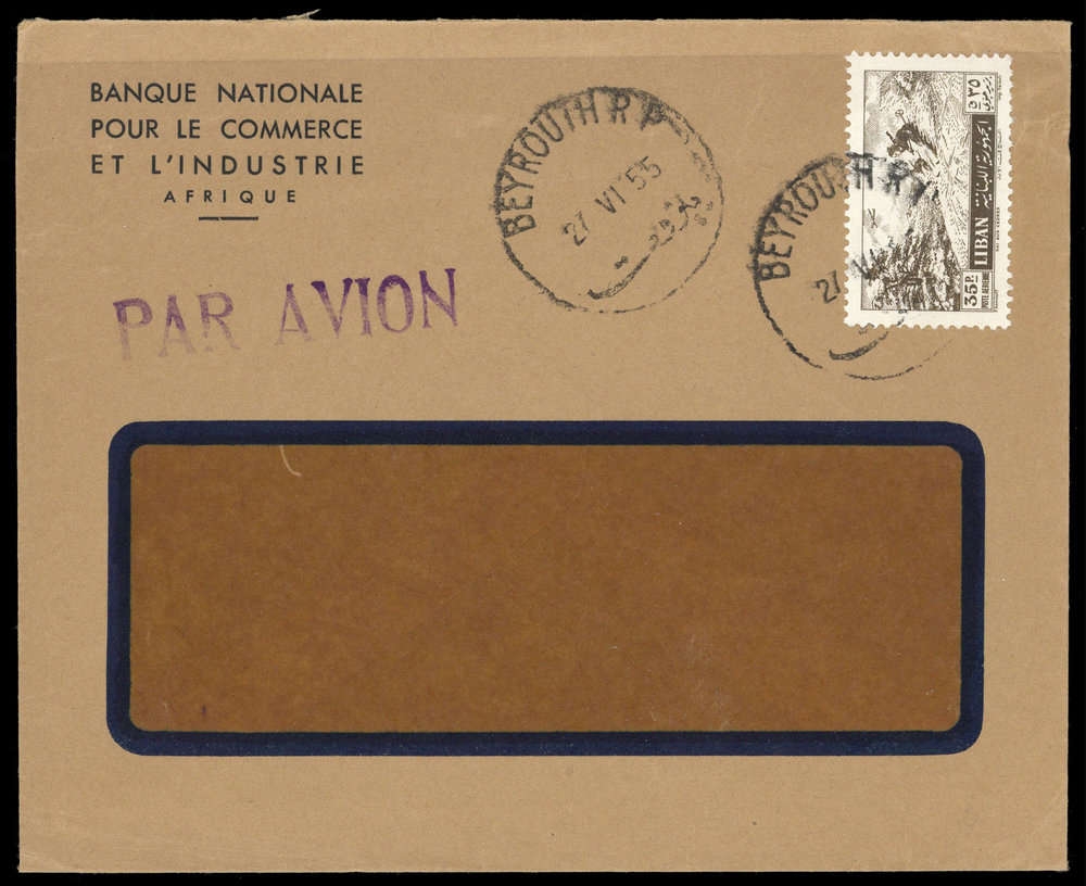 1955, 35 Pia braun, EF auf braunem Bank-Fensterumschlag, Knitter, per Luftpost, K1 "BEYROUTH 27 VI 55"