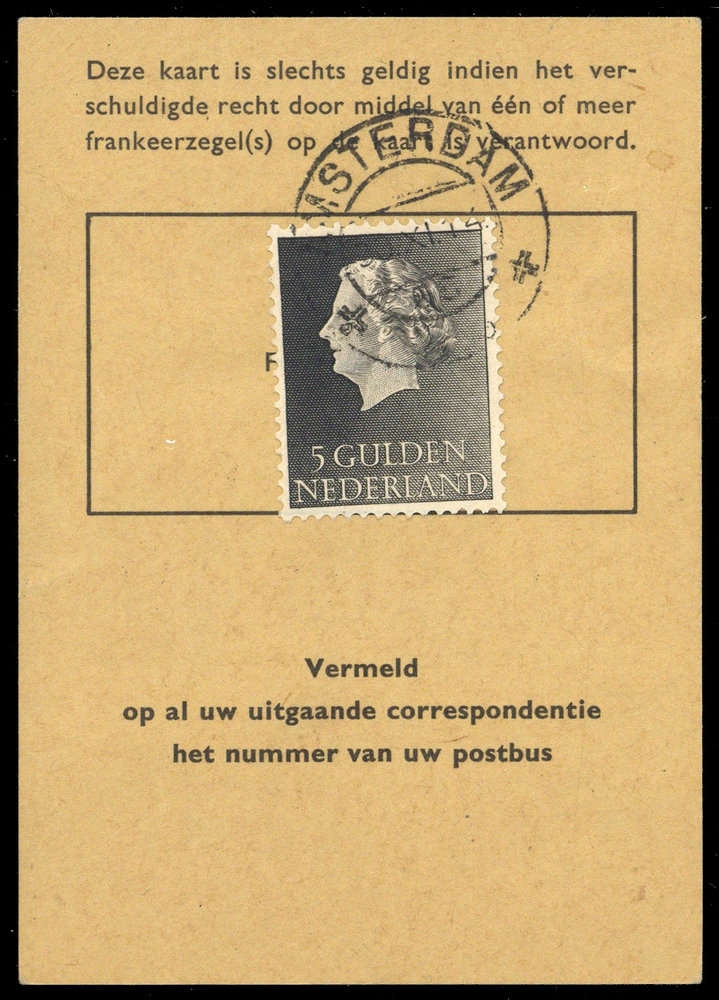 1955, PTT-Bewijs van Bevoegdheid .., Kantoor/Postbusnummer, rechte Hälfte mit 5 G Juliana, K2 "AMSTERDAM 30 XI 1966"