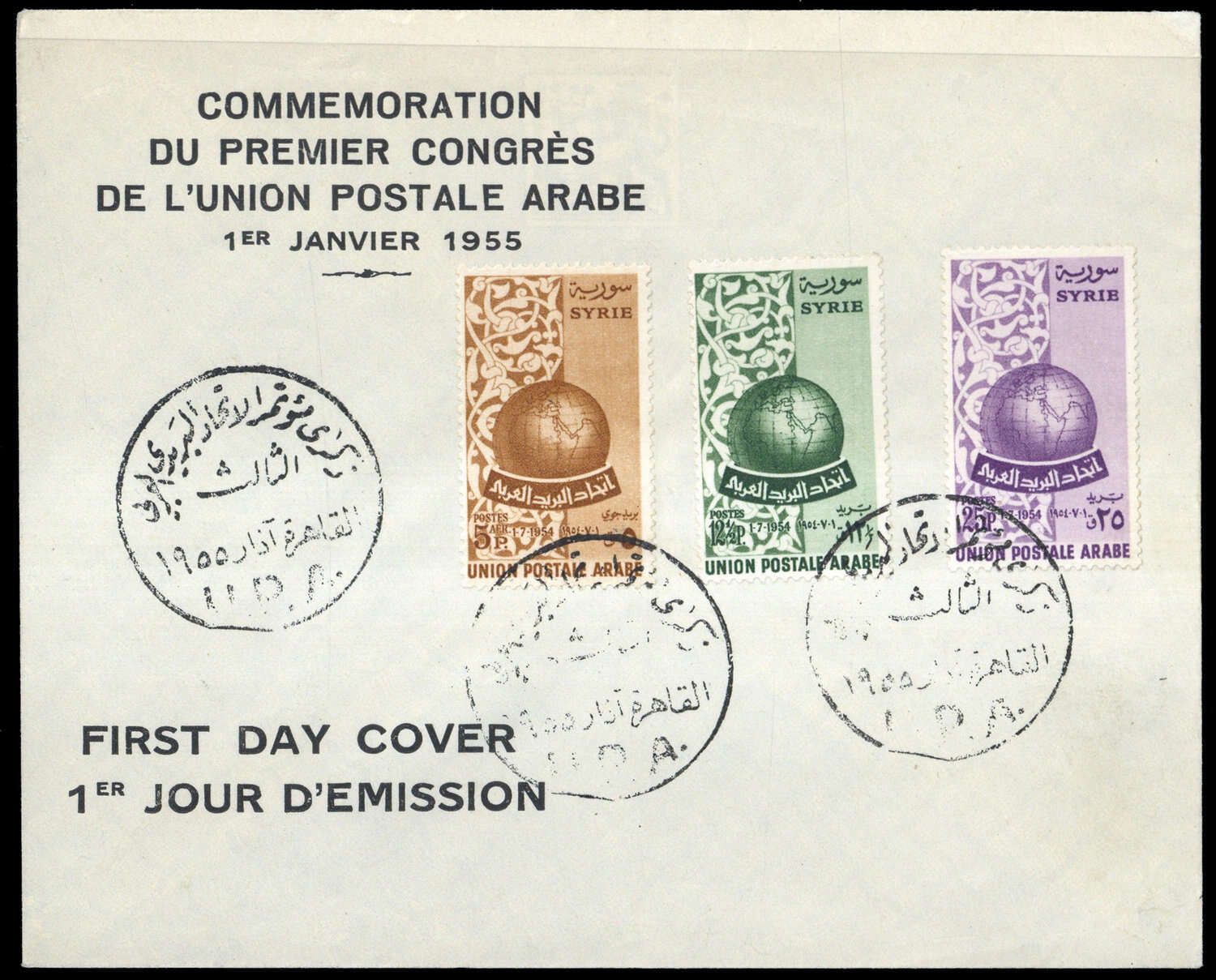 1955, 1/2 - 4 G Arabische Postunion auf FDC "U.P.A. 1.1.1955"
