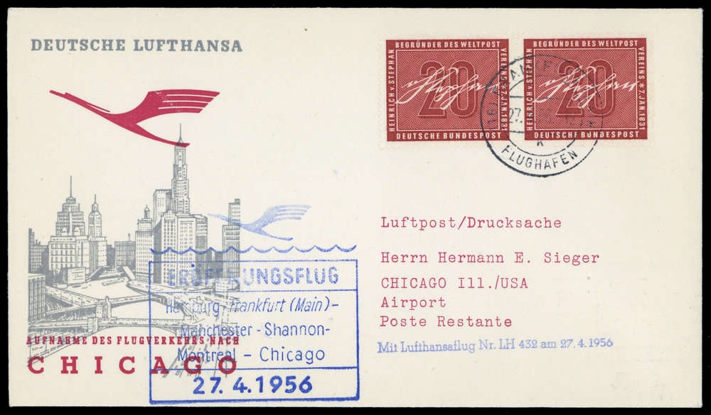 1956, ERSTFLUG DEUTSCHE LUFTHANSA Frankfurt/Main - Chicago auf passendem Schmuckkuvert mit Paar Nr. 227 frankiert von FRANKFURT/MAIN-FLUGHAFEN 27.4.1956, adressiert nach Chicago / USA, blauer Sonderbestätigungsstempel, rs, Ankunftsstempel.